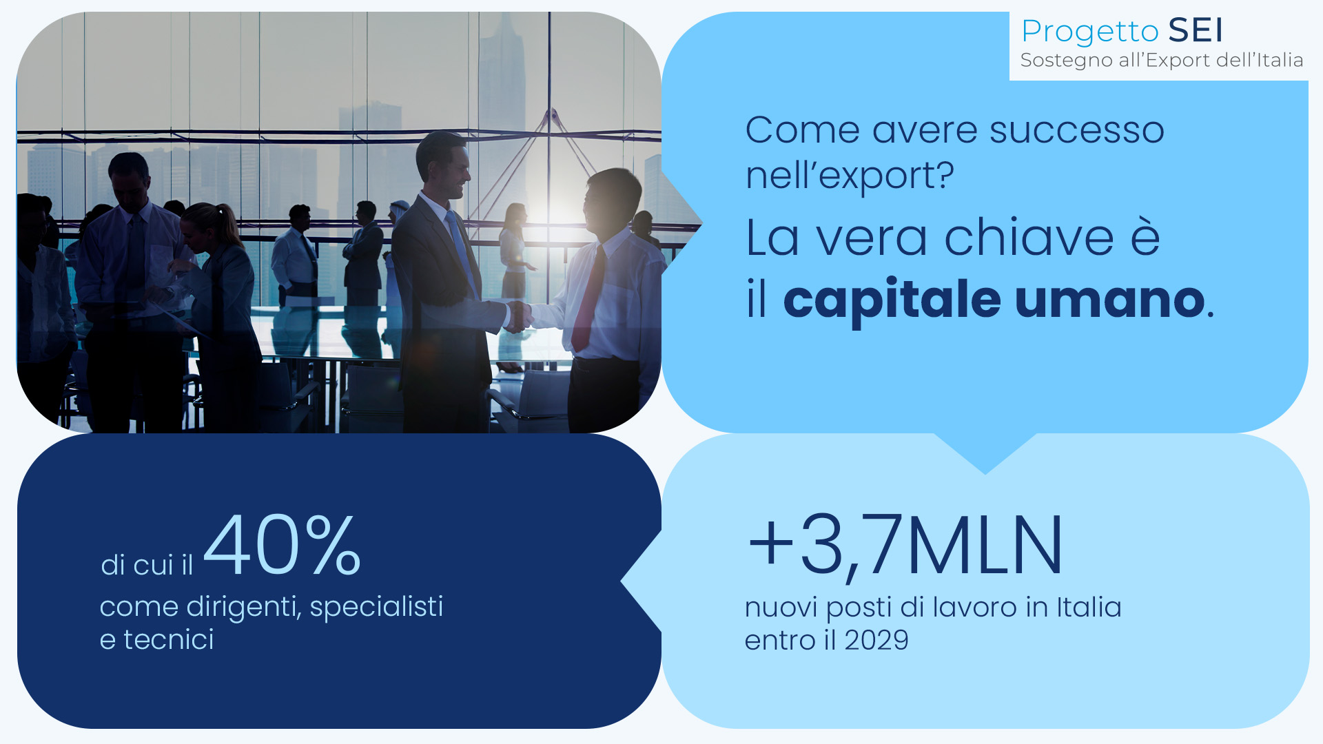 L’iscrizione è gratuita: se vuoi consolidare il capitale umano della tua impresa sui mercati internazionali, unisciti a Progetto SEI.