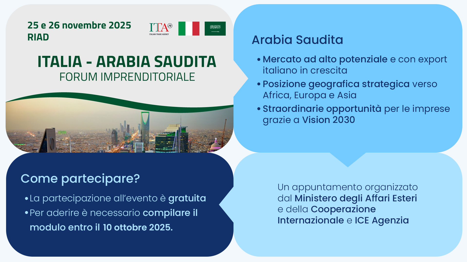 ll Ministero degli Affari Esteri e della Cooperazione Internazionale e ICE Agenzia organizzano il Forum Imprenditoriale Italia – Arabia Saudita, in programma il 25-26 novembre prossimi. Il forum è dedicato ai seguenti settori:
